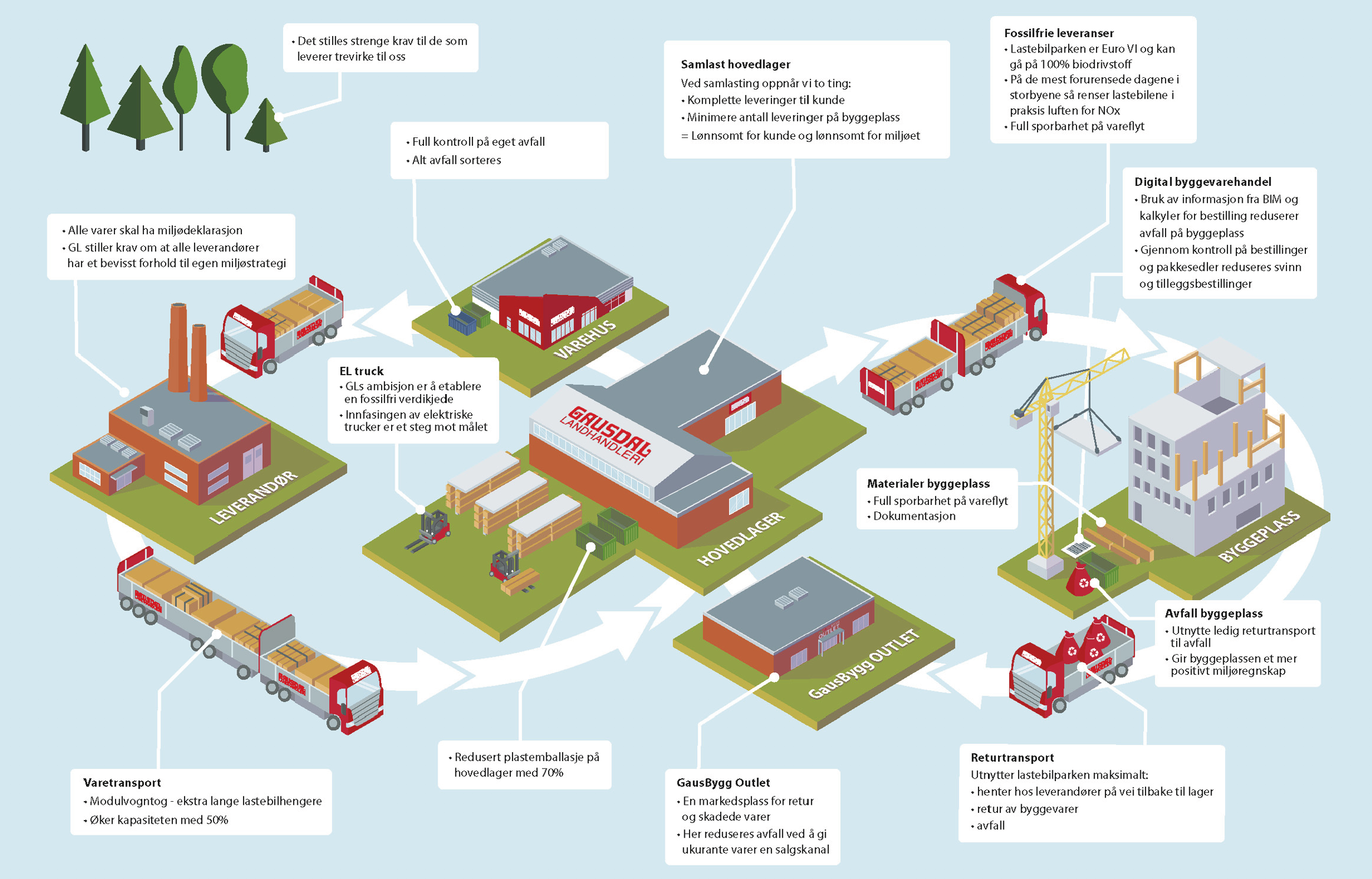 Ved kontinuerlig å forbedre måten vi kjøper, håndterer og distribuerer varer og tjenester på, forplikter vi oss til å minimere vår belastning på ytre miljø og klima.